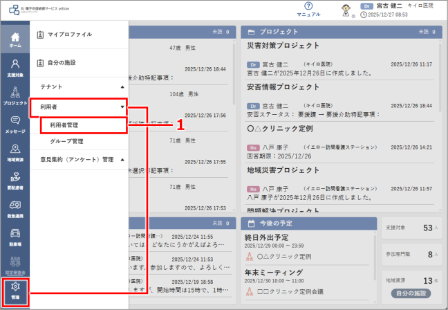 [管理]タブの[利用者]から[利用者管理]をクリックします。