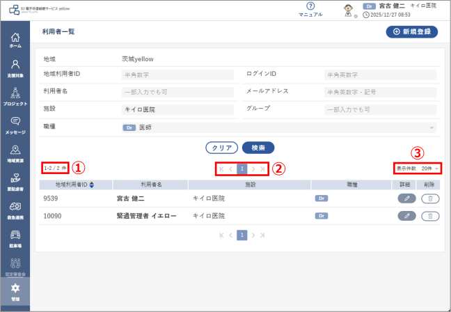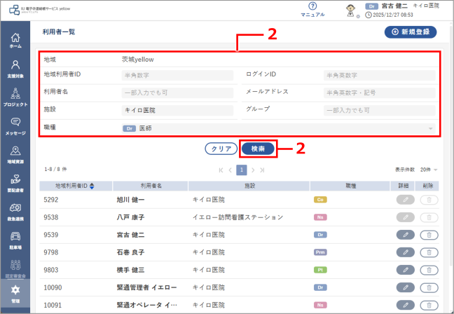 表示される利用者が多い場合は、検索条件を入力し[検索]ボタンをクリックします。