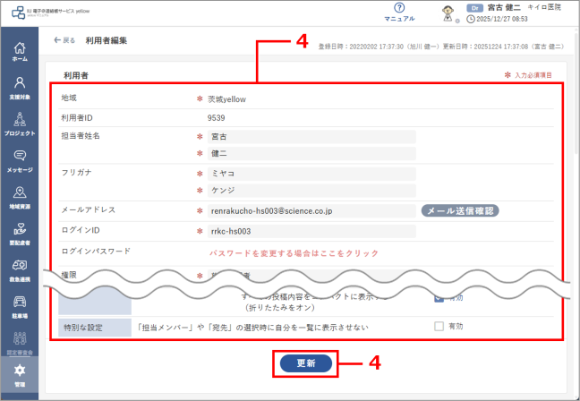 必要に応じて利用者情報を変更し、[更新]ボタンをクリックします。