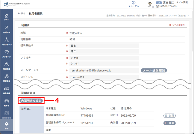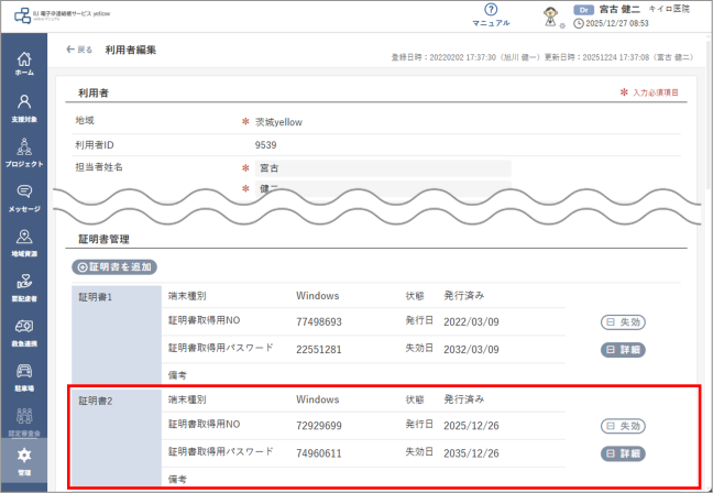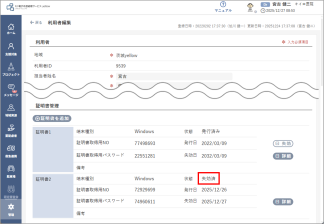 ➡ 証明書が失効され、[証明書管理]の該当の証明書の状態に「失効済」と表示されます。