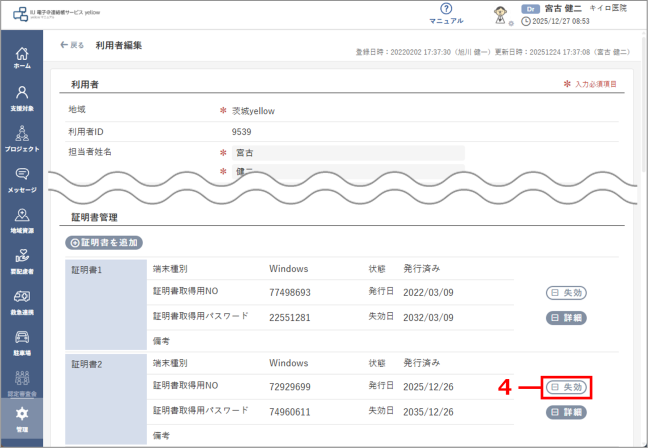 [証明書管理]で、失効する証明書の[失効]ボタンをクリックします。