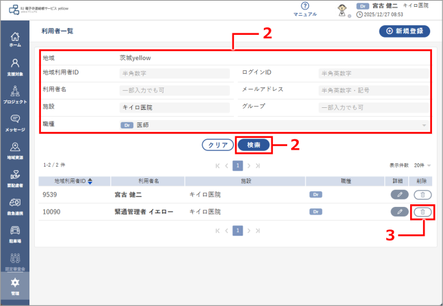 ➡ 利用者の削除が完了し、一覧に表示されなくなります。